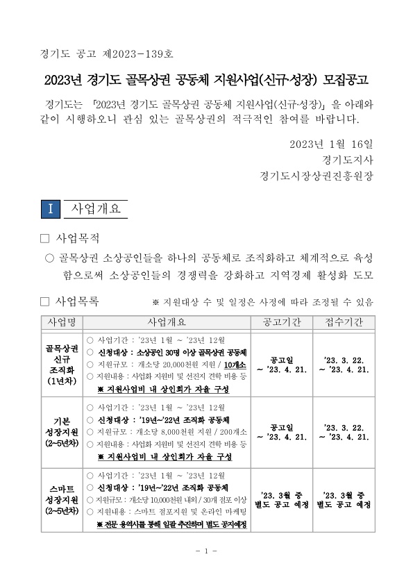 [경기도] 2023년 경기도 골목상권 공동체 지원사업(신규, 성장) 모집 공고