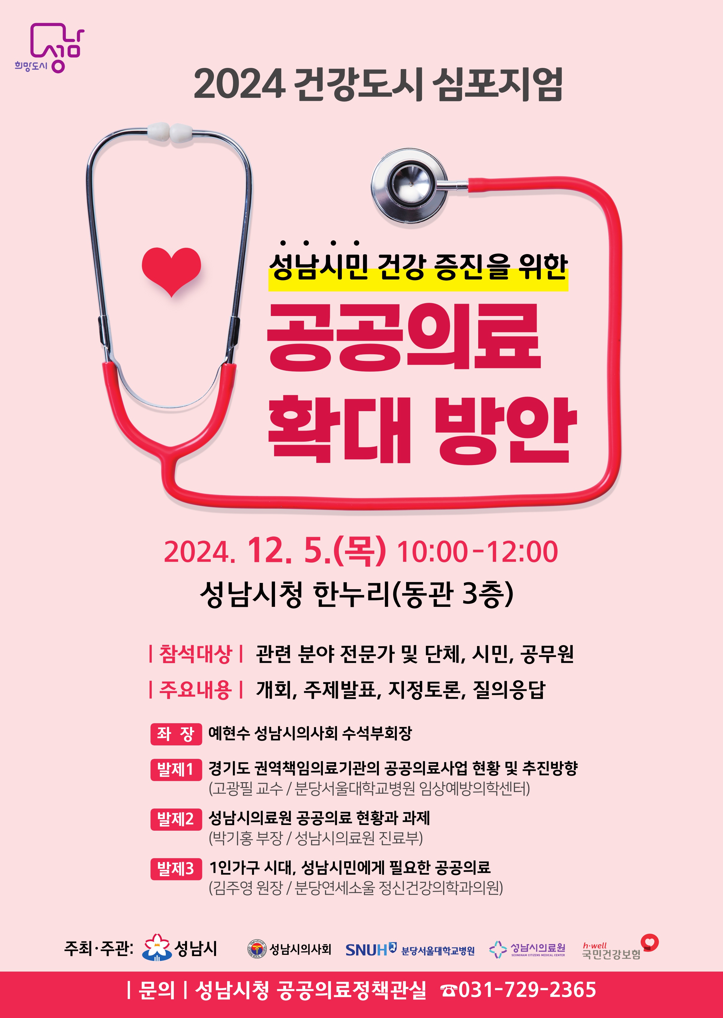 성남시에서는 "성남시민 건강 증진을 위한 공공의료 확대 방안"을 주제로 「2024년 건강도시 심포지엄」을 개최합니다.