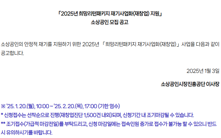 「2025년 희망리턴패키지 재기사업화(재창업) 지원」 소상공인 모집공고.hwp [미리보기]