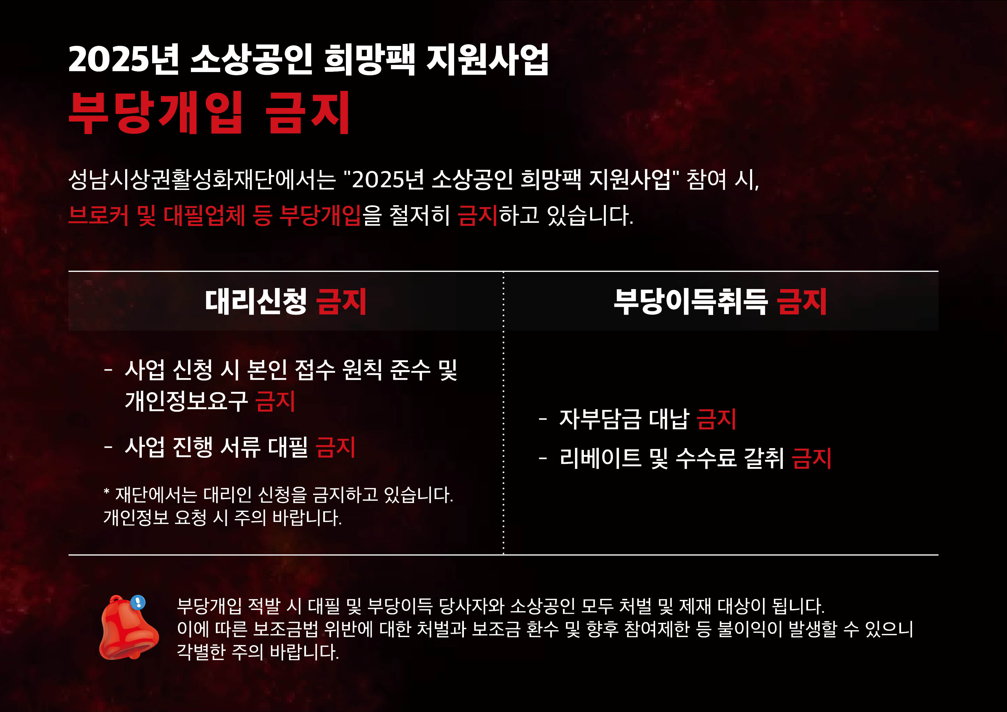 성남시상권활성화재단 상권운영팀에서 알립니다. 우리 재단은 소상공인 맞춤형 지원을 통해 점포 이미지 개선 및 매출 증가 방안을 모색 코자 “소상공인 희망팩 지원사업”을 추진하고 있으며, 지원 사업 내 부당 개입 등을 엄격히 금지하고 있습니다. “2025년 소상공인 희망팩 지원사업”과 관련하여 어떠한 영업 및 알선 행위를 하고 있지 않습니다. 이에 부당 개입과 소상공인 혼선이 가중될 것을 우려하여 재단 사칭 등이 발생할 경우 형사 고발 등의 조치를 취할 수 있음을 안내하고 해당 내용을 경고코자 합니다. 해당 지원 사업에 대하여는 031-759-2907으로 문의하시면 자세히 답변토록 하겠습니다. 앞으로 부당 개입 근절 및 공정하고 객관적인 소상공인 지원 사업이 될 수 있도록 경주하겠습니다.