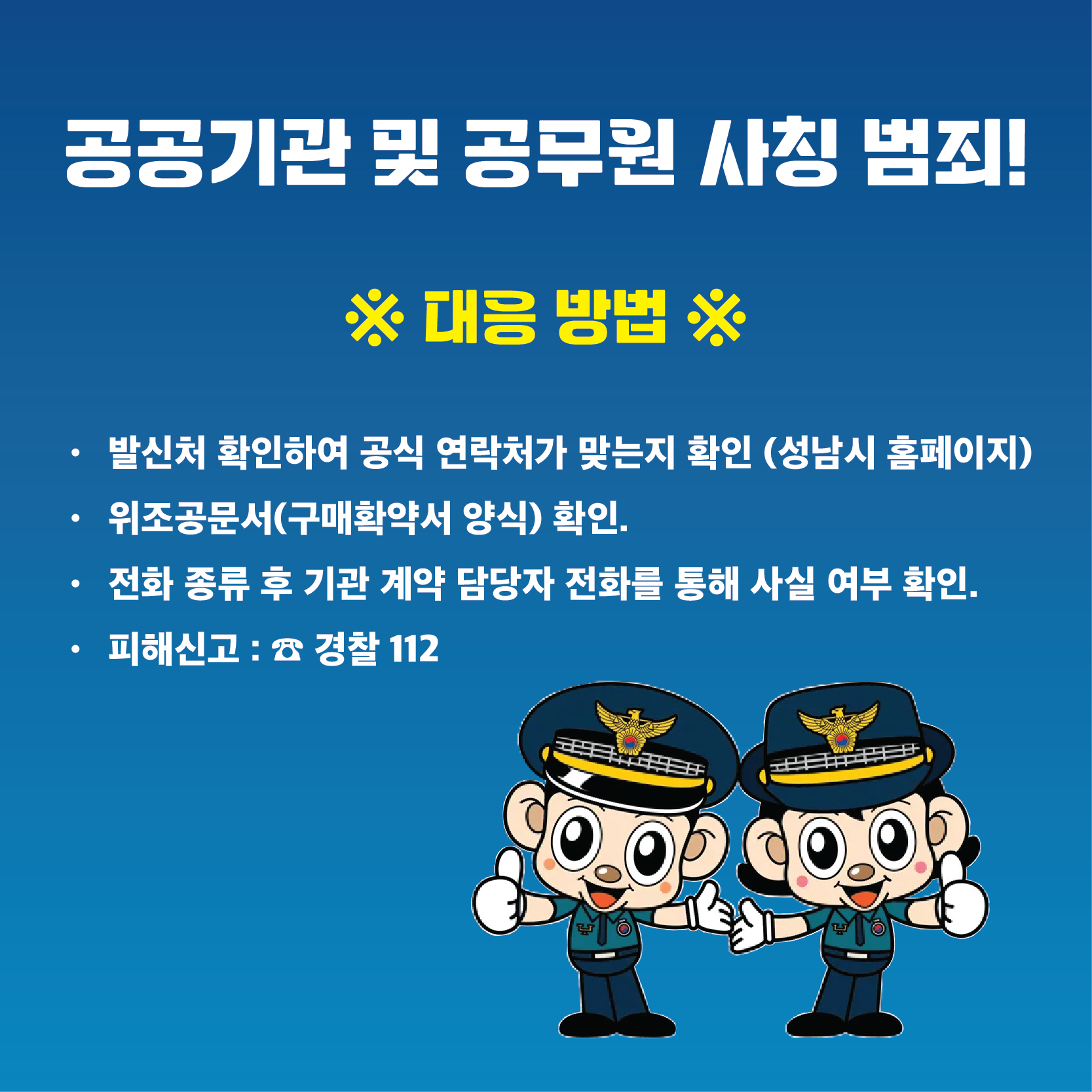 공공기관 및 공무원 사칭 범죄! 사기예방 및 대응방법 ■ 공공기관 임직원 사칭 금융상품 판매 사기 주의 (피해사례) · 나라장터에서 계약정보 확인. · 수요기관 계약담당자로 본인 소개. · 최근 계약건명과 날짜를 언급. · 금융상품 설명회 참석 및 가입유도, 금융상품 판매. (대응방법) · 발신처 확인하여 공식 연락처가 맞는지 확인. · 금융상품 설명회 등을 유도 할 경우 의심. · 전화 종료 후 기관 계약담당자 전화를 통해 사실 여부 확인. · 피해 신고: 금융감독원 금융소비자보호포털 파인 → 불법금융신고 → 보험모집질서위반 신고. ■ 공무원 사칭 허위물품 대납 사기 주의 ( 피해사례) · 수요기관 직원 이름으로 명함제작. · 허위공문서를 작성(구매확약서 위조)하여 물품납품 유도. · 특정업체를 소개하며 물품구매 및 대납계약 유도. (대응방법) · 발신처 확인. · 위조공문서(구매확약서 양식) 확인. · 전화 종료 후 기관 계약담당자 전화를 통해 사실 여부 확인. · 피해신고: ☎경찰112.